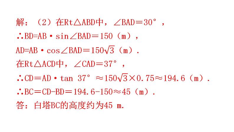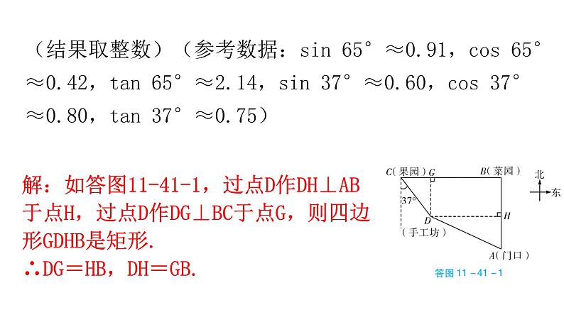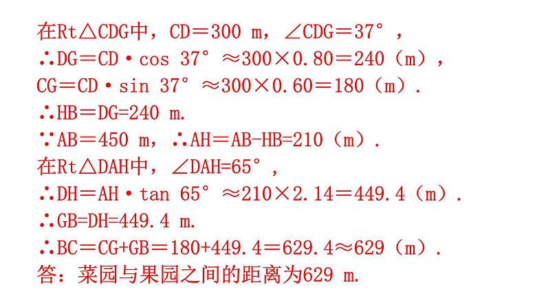 在Rt△CDG中,CD=300 m,∠CDG=37°,∴DG=CD·cs 37°≈300×0.80=240(m),CG=CD·sin 37°≈300×0.60=180(m).∴HB=DG=240 m.∵AB=450 m,∴AH=AB-HB=210(m).在Rt△DAH中,∠DAH=65°,∴DH=AH·tan 65°≈210×2.14=449.4(m).∴GB=DH=449.4 m.∴BC=CG+GB=180+449.4=629.4≈629(m).答:菜园与果园之间的距离为629 m.