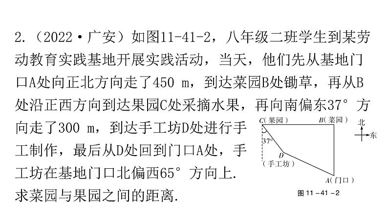 2.(2022·广安)如图11-41-2,八年级二班学生到某劳动教育实践基地开展实践活动,当天,他们先从基地门口A处向正北方向走了450 m,到达菜园B处锄草,再从B处沿正西方向到达果园C处采摘水果,再向南偏东37°方向走了300 m,到达手工坊D处进行手工制作,最后从D处回到门口A处,手工坊在基地门口北偏西65°方向上.求菜园与果园之间的距离.