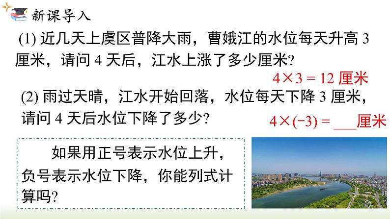 展开(1) 近几天上虞区普降大雨,曹娥江的水位每天升高 3 厘米,请问 4 天后,江水上涨了多少厘米?