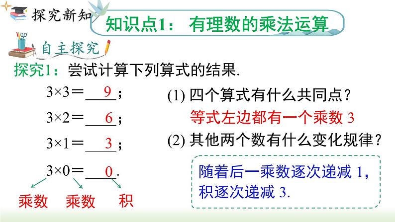 初中数学人教版七年级上册1.4.1 有理数的乘法课文课件ppt: 这是一份初中数学人教版七年级上册1.4.1 有理数的乘法课文课件ppt,共14页。PPT课件主要包含了温故而知新,1-6×5,25×-6,探索新知一,探索新知二,探究新知三,改一改,正确解法,想一想,练习2等内容,欢迎下载使用。
