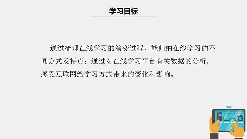 展开通过梳理在线学习的演变过程,能归纳在线学习的不同方式及特点;通过对在线学习平台有关数据的分析,感受互联网给学习方式带来的变化和影响。