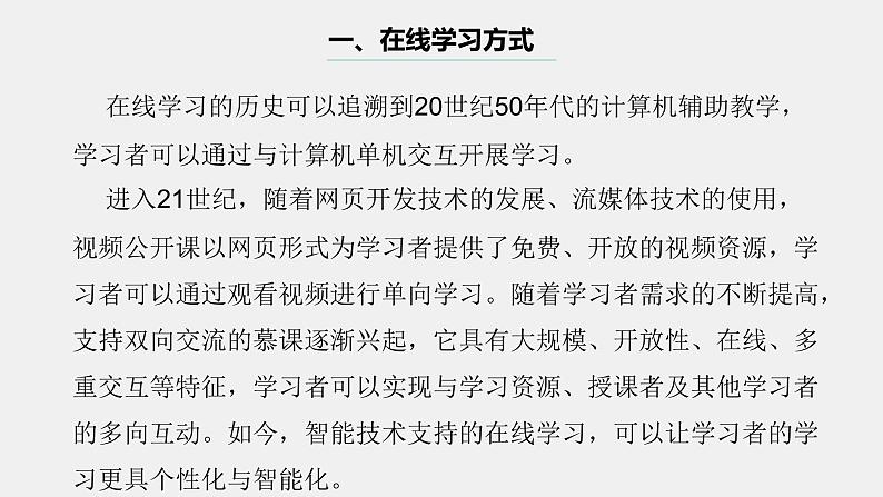 在线学习的历史可以追溯到20世纪50年代的计算机辅助教学,学习者可以通过与计算机单机交互开展学习。进入21世纪,随着网页开发技术的发展、流媒体技术的使用,视频公开课以网页形式为学习者提供了免费、开放的视频资源,学习者可以通过观看视频进行单向学习。随着学习者需求的不断提高,支持双向交流的慕课逐渐兴起,它具有大规模、开放性、在线、多重交互等特征,学习者可以实现与学习资源、授课者及其他学习者的多向互动。如今,智能技术支持的在线学习,可以让学习者的学习更具个性化与智能化。