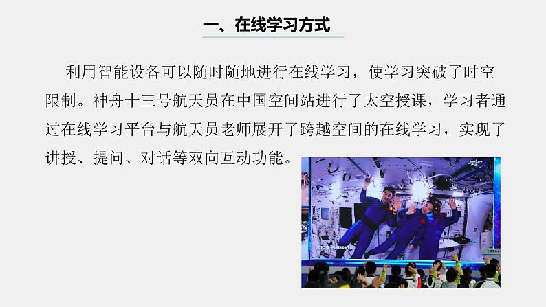 利用智能设备可以随时随地进行在线学习,使学习突破了时空限制。神舟十三号航天员在中国空间站进行了太空授课,学习者通过在线学习平台与航天员老师展开了跨越空间的在线学习,实现了讲授、提问、对话等双向互动功能。