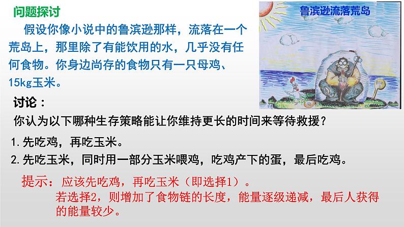 假设你像小说中的鲁滨逊那样,流落在一个荒岛上,那里除了有能饮用的水,几乎没有任何食物。你身边尚存的食物只有一只母鸡、15kg玉米。