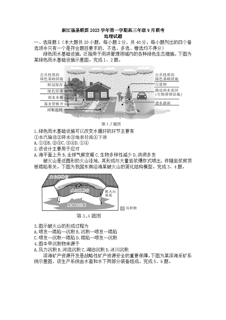 浙江省强基联盟2023-2024学年高三地理上学期9月联考试题(Word版附答案)