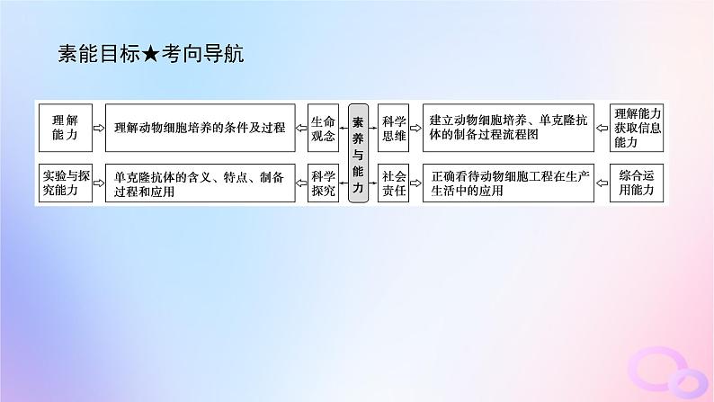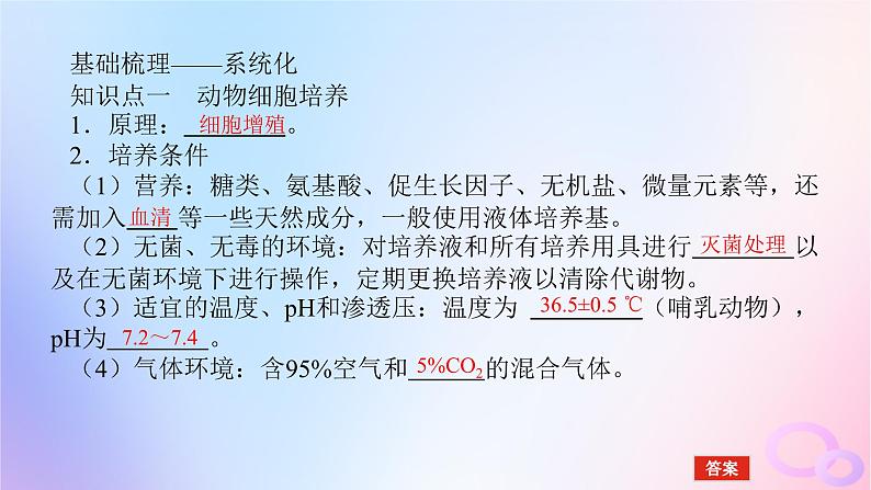 展开基础梳理——系统化知识点一 动物细胞培养1.原理: 。2.培养条件(1)营养:糖类、氨基酸、促生长因子、无机盐、微量元素等,还需加入 等一些天然成分,一般使用液体培养基。(2)无菌、无毒的环境:对培养液和所有培养用具进行 以及在无菌环境下进行操作,定期更换培养液以清除代谢物。(3)适宜的温度、pH和渗透压:温度为 (哺乳动物),pH为 。(4)气体环境:含95%空气和 的混合气体。