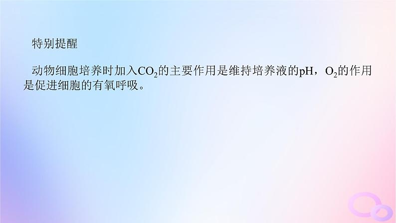 特别提醒动物细胞培养时加入CO2的主要作用是维持培养液的pH,O2的作用是促进细胞的有氧呼吸。