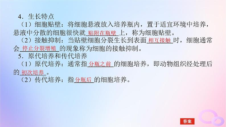 4.生长特点(1)细胞贴壁:将细胞悬液放入培养瓶内,置于适宜环境中培养,悬液中分散的细胞很快就 上,称为细胞贴壁。(2)接触抑制:当贴壁细胞分裂生长到表面 时,细胞通常会 的现象称为细胞的接触抑制。5.原代培养和传代培养(1)原代培养:通常指 的细胞培养,即动物组织经处理后的 。(2)传代培养:指 的细胞培养。