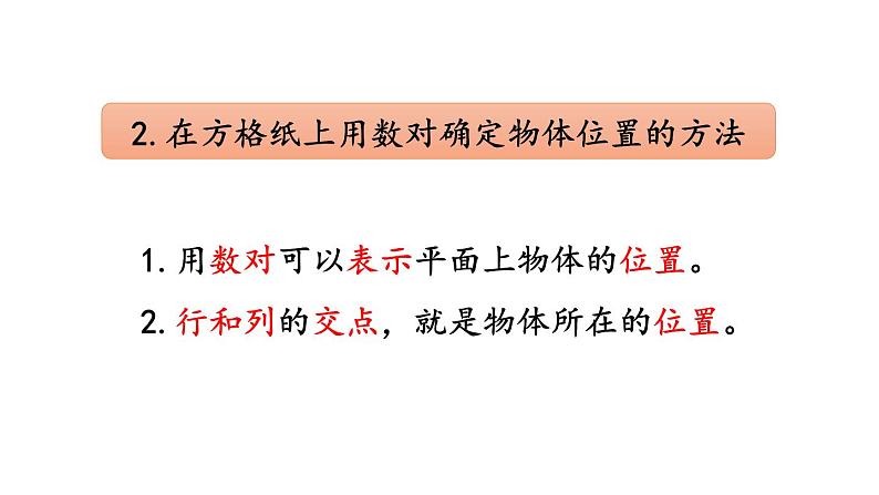 1.用数对可以表示平面上物体的位置。2.行和列的交点,就是物体所在的位置。