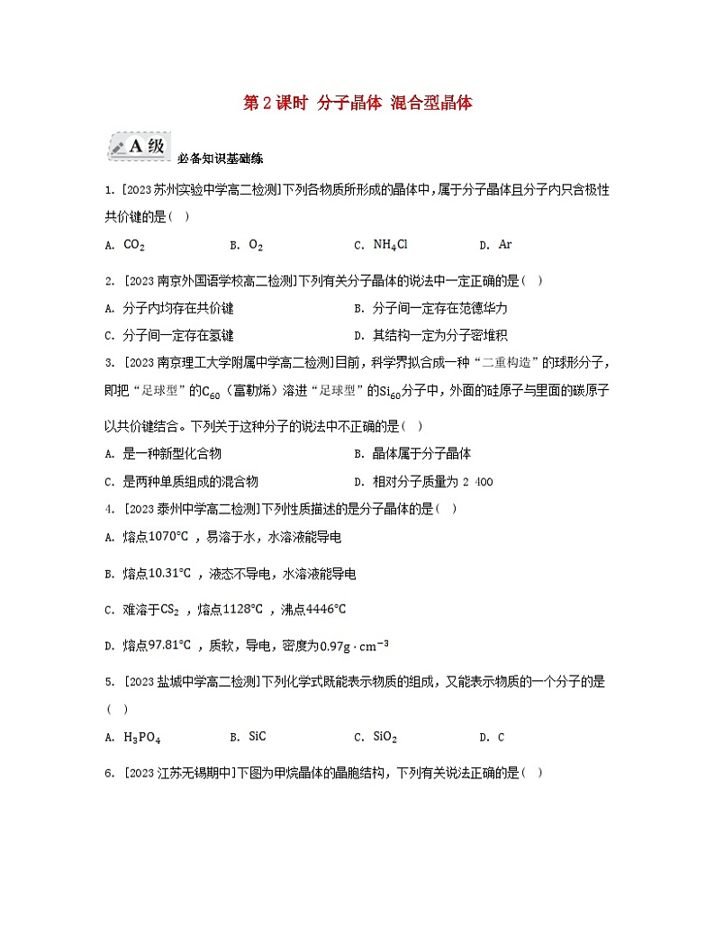 第2课时 分子晶体 混合型晶体 必备知识基础练A级1. [2023苏州实验中学高二检测]下列各物质所形成的晶体中,属于分子晶体且分子内只含极性共价键的是( )A. B. C. D. 2. [2023南京外国语学校高二检测]下列有关分子晶体的说法中一定正确的是( )A. 分子内均存在共价键 B. 分子间一定存在范德华力C. 分子间一定存在氢键 D. 其结构一定为分子密堆积3. [2023南京理工大学附属中学高二检测]目前,科学界拟合成一种“二重构造”的球形分子,即把“足球型”的(富勒烯)溶进“足球型”的分子中,外面的硅原子与里面的碳原子以共价键结合。下列关于这种分子的说法中不正确的是( )A. 是一种新型化合物 B. 晶体属于分子晶体C. 是两种单质组成的混合物 D. 相对分子质量为2 4004. [2023泰州中学高二检测]下列性质描述的是分子晶体的是( )A. 熔点 ,易溶于水,水溶液能导电B. 熔点 ,液态不导电,水溶液能导电C. 难溶于 ,熔点 ,沸点D. 熔点 ,质软,导电,密度为5. [2023盐城中学高二检测]下列化学式既能表示物质的组成,又能表示物质的一个分子的是( )A. B. C. D. C6. [2023江苏无锡期中]下图为甲烷晶体的晶胞结构,下列有关说法正确的是( )A. 甲烷晶胞中的球体只代表一个碳原子B. 晶体中1个 分子有12个紧邻的甲烷分子C. 晶体熔化时需克服共价键D. 1个甲烷晶胞中含有8个 分子7. ⅰ.下列分子晶体在熔化时,只破坏范德华力的是,既破坏范德华力,又破坏氢键的是。①②③(白磷) ④⑤⑥⑦⑧⑨⑩ⅱ.已知:物质沸点111.7161.2239.7185.4分解温度8737731 073713.2分析上表中四种物质的相关数据,请回答。(1) 和比较、和比较,沸点高低的原因是。(2) 和比较、和比较,分解温度高低的原因是。结合上述数据和规律判断,一定压强下和的混合气体降温时先液化。 关键能力提升练B级8. [2023南京外国语学校高二检测]中学教材上介绍的干冰晶体是一种面心立方结构,如图所示,即每8个构成立方体,且在6个面的中心又各占据1个分子,在每个周围距离(其中为立方体棱长)的有( )A. 4个 B. 8个 C. 12个 D. 6个9. [2023苏州外国语学校高二检测]六氟化硫分子为正八面体结构(分子结构如图),难溶于水,在高温下仍有良好的绝缘性,在电器工业方面具有广泛用途。下列推测正确的是( )A. 各原子均达8电子稳定结构B. 易燃烧生成C. 分子是含有非极性键的非极性分子D. 是分子晶体10. [2023扬州一中高二检测]晶胞是晶体结构中可重复出现的最小的结构单元,晶胞结构如下图所示,下列说法正确的是( )A. 摩尔质量是720B. 与苯互为同素异形体C. 在 晶胞中有14个 分子D. 每个 分子周围与它距离最近等距离的 分子有12个11. 下列关于晶体的叙述正确的是( )A. 分子晶体中,共价键的键能越大,熔、沸点越高B. 石墨为分子晶体,层内碳原子以共价键相连,熔点高C. 共价晶体中,共价键的键能越大,熔、沸点越高D. 某晶体溶于水后,可电离出自由移动的离子,该晶体一定是离子晶体12. [2023苏州实验中学高二检测]下列分子晶体:①、②、③、④、⑤、⑥的熔点由高到低的顺序是( )A. ①②③④⑤⑥ B. ③②①⑤④⑥ C. ③②①④⑤⑥ D. ⑥⑤④③②①13. 型化合物形成的晶体结构多种多样。下图所示的几种结构所表示的物质最有可能是分子晶体的是( )①②③④⑤⑥A. ①③ B. ②⑤ C. ⑤⑥ D. ③④⑤⑥14. [2023南京外国语学校高二检测](1) 冰晶胞中水分子的空间排列方式与金刚石晶胞(其晶胞结构如图,其中空心球所示原子位于立方体的顶点或面心,实心球所示原子位于立方体内)类似。每个冰晶胞平均占有个水分子。冰晶胞与金刚石晶胞中微粒排列方式相同的原因是。(2) 实验测得冰中氢键的作用能为,而冰的熔化热为,这说明。15. [2023泰州中学高二检测]如下图所示为分子晶体结构的一部分。(1) 干冰常压下极易升华,在工业上用作制冷剂,试解释其原因:。(2) 在一定温度下,测得干冰晶胞(即图所示)的边长,则该温度下干冰的密度为(结果精确至)。(3) 试判断:晶体和晶体的沸点由高到低排列的顺序是(填写相应物质的化学式)。 学科素养创新练C级16. ⅣA族元素及其化合物在材料等方面有重要用途。回答下列问题:(1) 碳的一种单质的结构如图(a)所示。该单质的晶体类型为,原子间存在的共价键类型有。图(a)(2) 四卤化硅的沸点和二卤化铅的熔点如图(b)所示。图(b)① 的沸点依、、、次序升高的原因是。② 结合的沸点和的熔点的变化规律,可推断:依、、、次序,中的化学键的离子性(填“增强”“不变”或“减弱”,下同)、共价性。(3) 碳的另一种单质可以与钾形成低温超导化合物,晶体结构如图(c)所示。位于立方体的棱上和立方体的内部,此化合物的化学式为;其晶胞参数为,晶胞密度为(结果精确至)。图(c) 第2课时 分子晶体 混合型晶体A级 必备知识基础练1. A[解析]固体(干冰)是分子晶体,分子内只有极性的碳氧共价键。、的固体都属于分子晶体,但中只有非极性共价键,原子间没有共价键。由和构成,是离子化合物,不属于分子晶体。2. B[解析]稀有气体是单原子分子,呈固态时原子间通过范德华力结合成晶体,其分子内不存在任何化学键,项错误;分子间作用力包括范德华力和氢键,范德华力存在于所有的分子晶体中,而只有部分分子晶体的分子间存在氢键,项正确,项错误;只存在范德华力的分子晶体才采取分子密堆积的方式,项错误。3. C[解析]由“二重构造”的球形分子可知,晶体属于分子