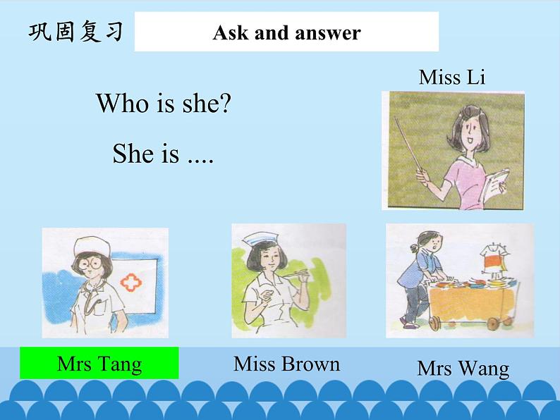 2.学会新词Mr——先生, 注意Miss小姐,Mrs夫人、太太,要放在姓氏之前哦。