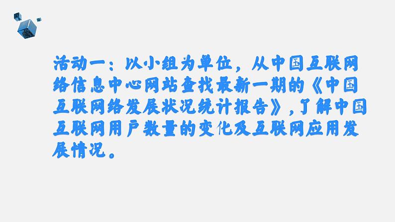 二、 新授 | 一、中国互联网的发展 (一)中国互联网发展大事件 播放视频2023年3月2日,中国互联网络信息中心发布了第51次《中国互联网络发展状况统计报告》。