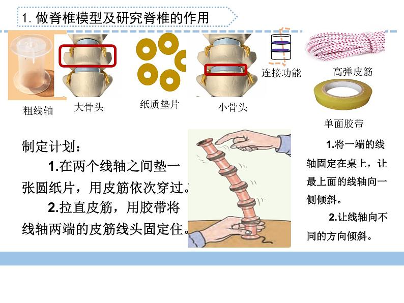 制定计划: 1.在两个线轴之间垫一张圆纸片,用皮筋依次穿过。 2.拉直皮筋,用胶带将线轴两端的皮筋线头固定住。