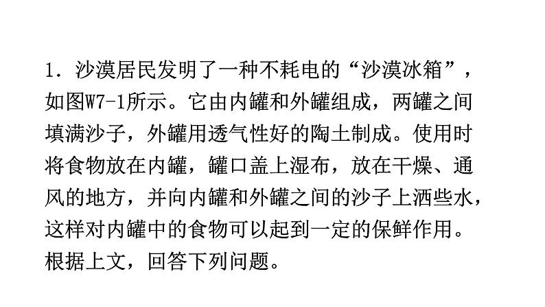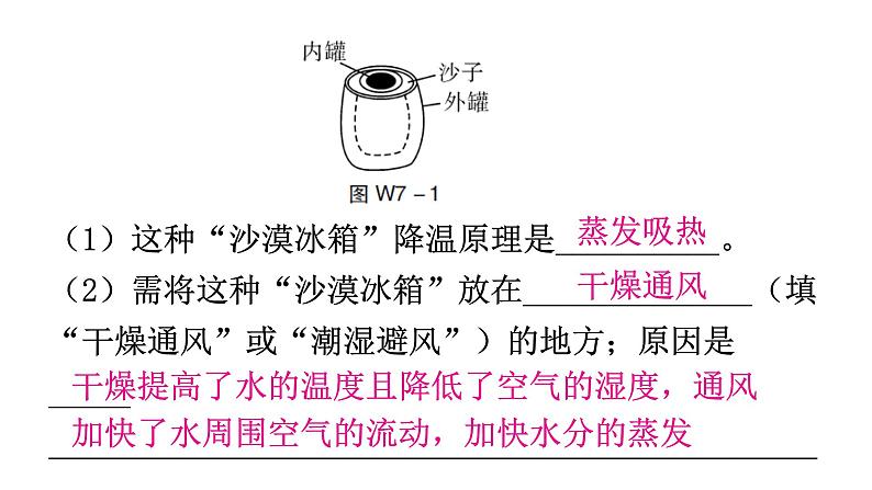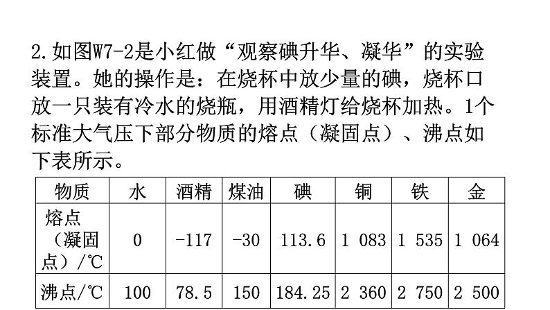第四章 物质的形态及其变化微专题7 综合能力题1.沙漠居民发明了一种不耗电的“沙漠冰箱”,如图W7-1所示。它由内罐和外罐组成,两罐之间填满沙子,外罐用透气性好的陶土制成。使用时将食物放在内罐,罐口盖上湿布,放在干燥、通风的地方,并向内罐和外罐之间的沙子上洒些水,这样对内罐中的食物可以起到一定的保鲜作用。根据上文,回答下列问题。(1)这种“沙漠冰箱”降温原理是__________。(2)需将这种“沙漠冰箱”放在______________(填“干燥通风”或“潮湿避风”)的地方;原因是___________________________________________________________________________________________。蒸发吸热干燥通风干燥提高了水的温度且降低了空气的湿度,通风加快了水周围空气的流动,加快水分的蒸发2.如图W7-2是小红做“观察碘升华、凝华”的实验装置。她的操作是:在烧杯中放少量的碘,烧杯口放一只装有冷水的烧瓶,用酒精灯给烧杯加热。1个标准大气压下部分物质的熔点(凝固点)、沸点如下表所示。实验中碘加热后,先后出现了液态和气态的碘,烧瓶底部有小颗粒出现。请你判断小红所做的实验中,碘先发生的物态变化__________(填“属于”或“不属于”) 升华现象,整个实验过程,碘经历的物态变化依次是__________、__________ 、__________,小红的实验__________(填“能”或“不能”)得出碘升华的结论。请你分析小红的实验装置,选用上述器材或补充必要的辅助器材设计一个实验,证明碘直接从固态变为气态,写出实验方案。________________________________________________________________________________________。不属于熔化汽化凝华不能不能让碘直接用酒精灯的火焰加热,改用水浴法加热碘3. 阅读下列短文,回答问题。生活中处处都有物态变化的现象。厨房的炉子上正架着一口装了水的锅,盖上锅盖,加热锅里的水。几分钟后就可以听到“咕噜咕噜”的水声从锅里传来;揭开锅盖,“一股白气”迅速冒出来。打开冰箱,上层的隔板上放有一些蔬菜,仔细观察后发现,有时蔬菜上浮着一些“小冰粒”。把蔬菜拿出冰箱一会儿后,那些“小冰粒”就会消失,只剩下蔬菜叶上的水珠。(1)“一股白气”迅速冒出来,“白气”的形成是__________(填“热锅”或“空气”)中的水蒸气__________(填物态变化名称)形成的小水珠。(2)有时蔬菜上浮着一些“小冰粒”。“小冰粒”的形成是水洗后蔬菜上的小水珠__________(填物态变化名称)形成的。那些“小冰粒”就会消失,只剩下蔬菜叶上的水珠。“小冰粒”的消失是因为小冰粒__________(填物态变化名称)变成了小水珠。热锅液化凝固熔化(3)下列事例中,为了防止熔化和凝固产生不利影响的是__________(填字母)。A. 冰冻食品可以保鲜B. 将熔融玻璃制成玻璃板C. 冬天将水箱中水放掉D. 高热病人利用冰袋降温C