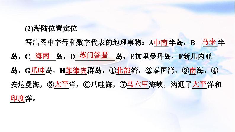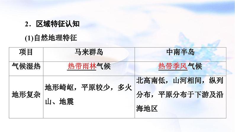 第一节 世界热点地区第二十章 世界地理立足四层·提升四翼01认识地区1认识地区2认识地区3认识地区4认识地区5中南马来海南苏门答腊爪哇菲律宾北部南太平马六甲太平印度热带雨林热带季风热带季雨河口三角洲锡矿锡镍冲积平原热带种植园马六甲海峡热带季风较低增加旱雨旱涝地质经济社会 阿富汗 沙特阿拉伯黑海阿拉伯海波斯湾土耳其霍尔木兹苏伊士运河曼德两洋三洲五海沙漠石油波斯湾白色阿拉伯伊斯兰教石油化工高温地中海石油输油管道市场气候赤道高原东南西北东非大裂谷白色黑色初级产品大低铁路时令河水路较大较少断流时令热带草原大气降水较低强增加大西洋地中海北冰洋波罗的海斯堪的纳维亚巴尔干减少大陆性东西温带落叶阔叶亚热带常绿硬叶小阿尔卑斯白色负增长乳畜山脉平原南部北部寒冷木材乳畜北北大西洋南美洲德雷克大西洋印度太平洋高原干燥煤铁 淡水库长城中山 泰山 北美 欧 亚洲 北冰洋格陵兰石油黄河