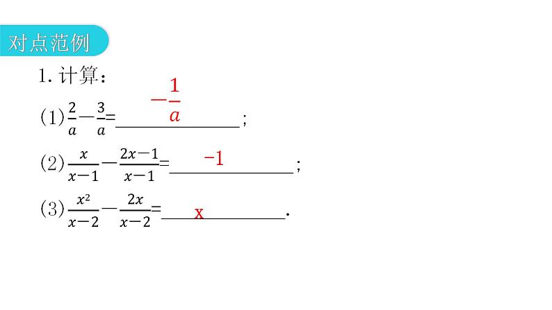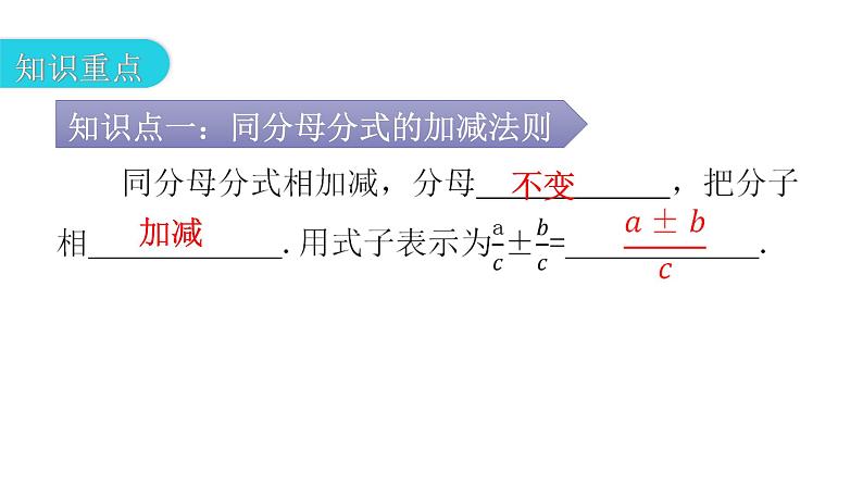 这是一份初中人教版15.2.2 分式的加减教学课件ppt,共19页。PPT课件主要包含了知识重点,对点范例,典型例题,举一反三等内容,欢迎下载使用。