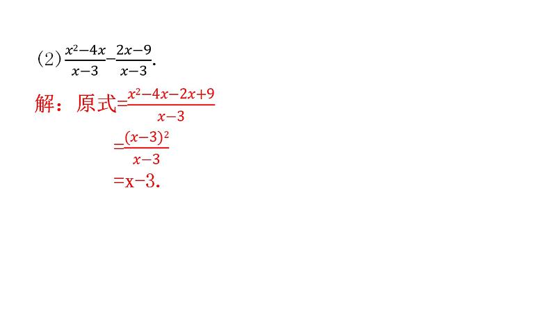 思路点拨:根据同分母分式的加减法则,分母不变,分子相加减,若分子为多项式,则添加括号后相加减,分子去括号时注意符号变化,合并同类项,最后结果化为最简分式.