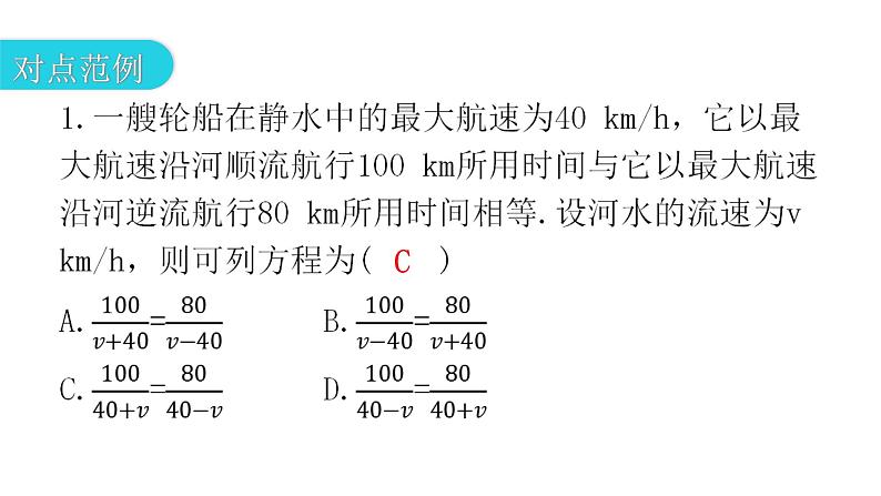 【例3】一艘轮船在相距80 km的两个码头之间航行.顺水航行60 km所需时间与逆水航行48 km所需时间相同,已知水流的速度是2 km/h,求轮船在静水中航行的速度.