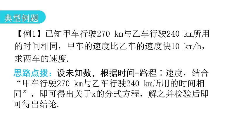 【例1】已知甲车行驶270 km与乙车行驶240 km所用的时间相同,甲车的速度比乙车的速度快10 km/h,求两车的速度.