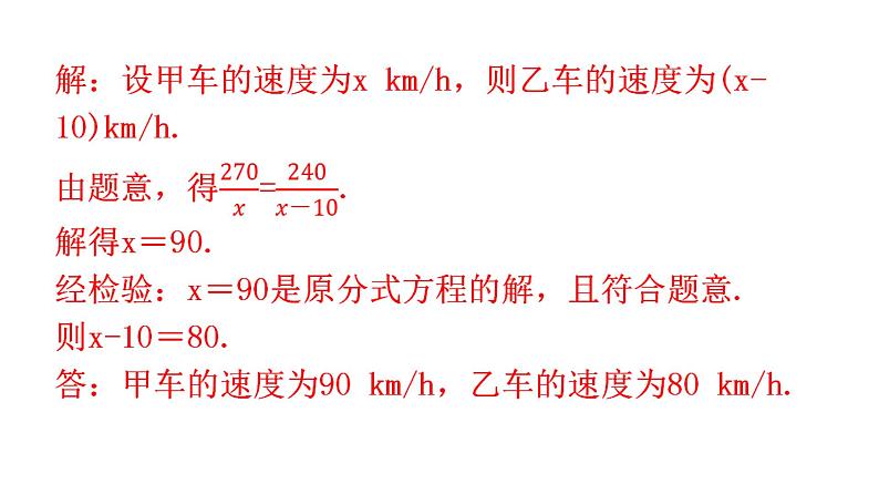 思路点拨:设未知数,根据时间=路程÷速度,结合“甲车行驶270 km与乙车行驶240 km所用的时间相同”,即可得出关于x的分式方程,解之并检验后即可得出结论.
