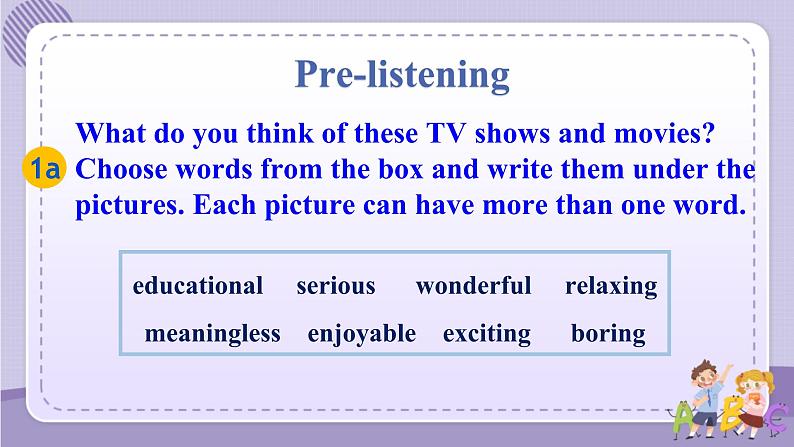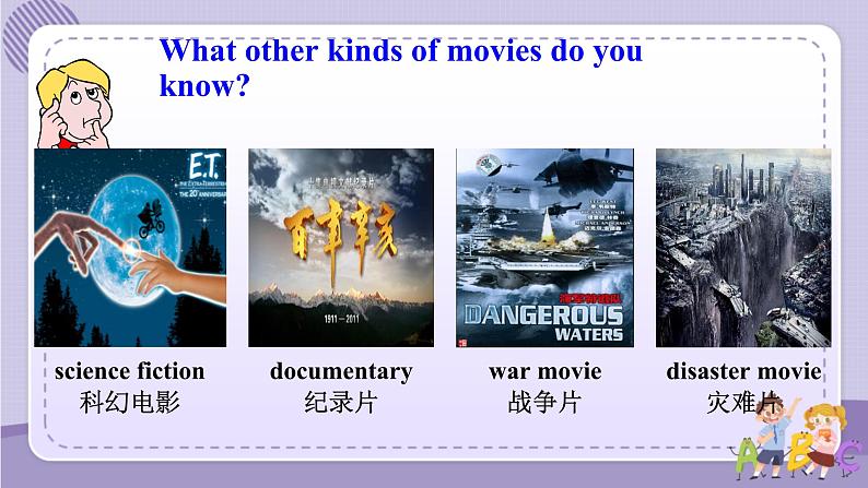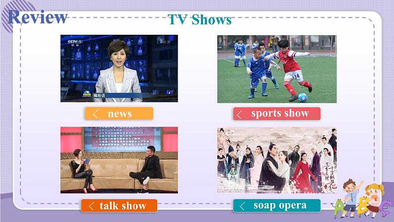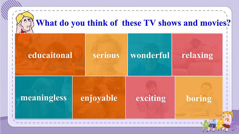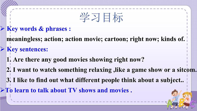 展开Key wrds & phrases : meaningless; actin; actin mvie; cartn; right nw; kinds f. Key sentences: 1. Are there any gd mvies shwing right nw? 2. I want t watch smething relaxing ,like a game shw r a sitcm. 3. I like t find ut what different peple think abut a learn t talk abut TV shws and mvies .