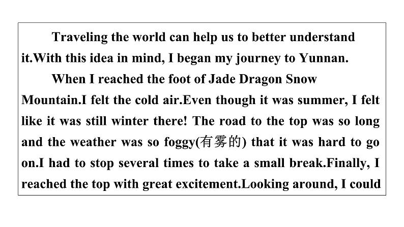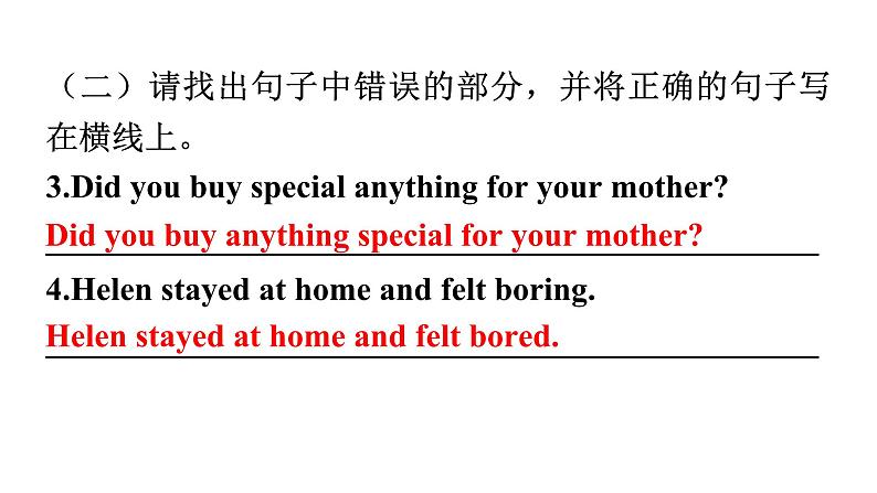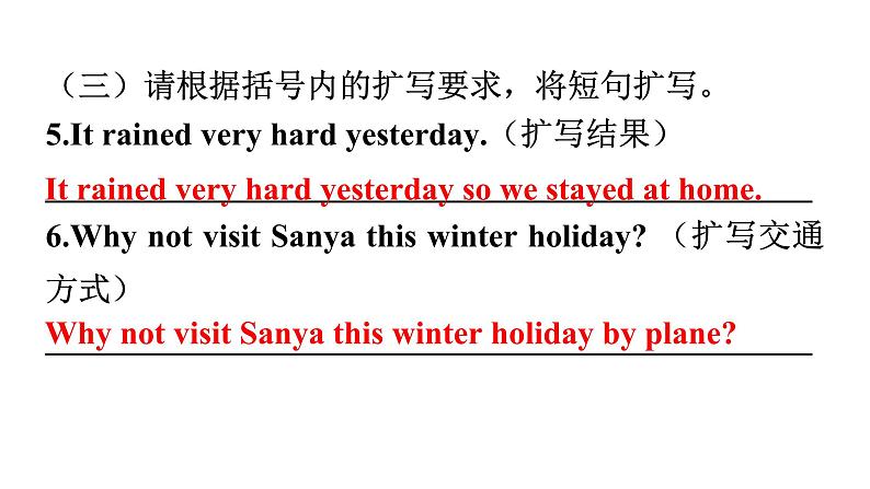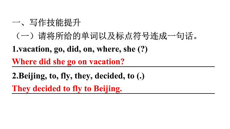 Unit 1 Where did you go on vacation?单元读写训练一、写作技能提升(一)请将所给的单词以及标点符号连成一句话。1.vacation, go, did, on, where, she (?)_______________________________________________2.Beijing, to, fly, they, decided, to (.)_______________________________________________Where did she go on vacation?They decided to fly to Beijing.(二)请找出句子中错误的部分,并将正确的句子写在横线上。3.Did you buy special anything for your mother?_______________________________________________4.Helen stayed at home and felt boring._______________________________________________Did you buy anything special for your mother?Helen stayed at home and felt bored.(三)请根据括号内的扩写要求,将短句扩写。5.It rained very hard yesterday.(扩写结果)_______________________________________________6.Why not visit Sanya this winter holiday? (扩写交通方式)_______________________________________________It rained very hard yesterday so we stayed at home.Why not visit Sanya this winter holiday by plane?二、读写综合 A.回答问题 请阅读下面短文,根据所提供的信息,回答5个问题。要求所写答案语法正确、语义完整切题,并把答案写在横线上。 Traveling the world can help us to better understand it.With this idea in mind, I began my journey to Yunnan. When I reached the foot of Jade Dragon Snow Mountain.I felt the cold air.Even though it was summer, I felt like it was still winter there! The road to the top was so long and the weather was so foggy(有雾的) that it was hard to go on.I had to stop several times to take a small break.Finally, I reached the top with great excitement.Looking around, I could hardly believe my eyes.The mountain was covered in snow and shone(反光) like glass in the rising sun.And everything looked wonderful.Looking at the beautiful, natural sights, I felt smaller than an ant(蚂蚁).What an amazing feeling! After climbing the snowy mountain, I visited Lijiang, an old city with a history of about 800 years.When I walked on the stone path, it felt like walking through a long history step by step.Along the way, I noticed that the houses looked old but beautiful.I really love the city and its slow lifestyle.1.Why did the writer begin the journey to Yunnan?______________________________________________________________________________________________2.When did the writer visit Yunnan, in summer or in winter?_______________________________________________Because the writer thought traveling the world can help us to better understand it.The writer visited Yunnan in summer./ In summer.3.How did the writer feel when looking at the beautiful, natural sights?______________________________________________________________________________________________4.How long is the history of Lijiang?_______________________________________________5.What did the houses along the way look like?_______________________________________________The writer felt smaller than an ant (when looking at the beautiful, natural sights).Lijiang / It has a history of about 800 years./ About 800 years.The houses along the way looked old but beautiful.B.书面表达读万卷书,行万里路。旅途中有别样的风景和感悟。请根据以下提示,描述一次你的旅行经历。内容包括:(1)你去旅行的时间、地点和天气;(2)你看到的人、景物和做了什么事情(至少两点);(3)你的心情怎么样。作文要求:(1)不能照抄原文;不得在作文中出现真实校名和学生的真实姓名。(2)语句连贯,词数80左右。【巧列提纲】( 部分仅供参考,希望同学们可以多开动脑筋、发散思维)【实战演练】________________________________________________________________________________________________________________________________________________________________________________________________________________________________________________________________________________________________________________________________________________________________________________________ Last Saturday I went to Sunflower Garden for a vacation with my family.It was sunny that day.Everything seemed great.When I walked into the garden, I could see many people waiting for their turns to play the games.I waited in line and then played the games happily.After that I went to see the flower show.I could see lovely roses, yellow sunflowers and so on.How beautiful they were! I had a great time that day.【语言点拨】(以下短语及句子仅供参考,旨在帮助同学们升级文章的语言表达)1.所见和所做:play beach volleyball 打沙滩排球 eat lots of seafood 吃大量的海鲜taste delicious wine 品尝美酒 buy something nice 买些好东西places of interest 名胜古迹 go sightseeing 去观光learn local culture 学习当地文化 When I …, I could … 当我……的时候,我可以……。2.心情:tired but excited很累但是很激动 have a good time / have fun / enjoy oneself 玩得开心All in all, it was a / an … day / vacation / trip.总而言之,那是……的一天 / 一个假期 / 一次旅行。