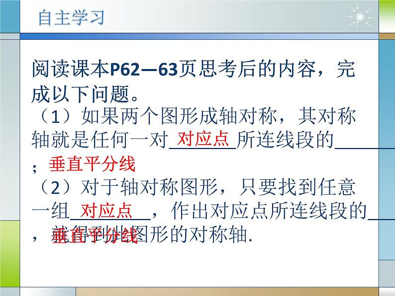 阅读课本P62—63页思考后的内容,完成以下问题。(1)如果两个图形成轴对称,其对称轴就是任何一对 所连线段的 ;(2)对于轴对称图形,只要找到任意一组 ,作出对应点所连线段的 ,就得到此图形的对称轴.