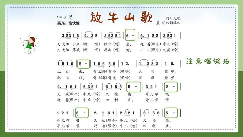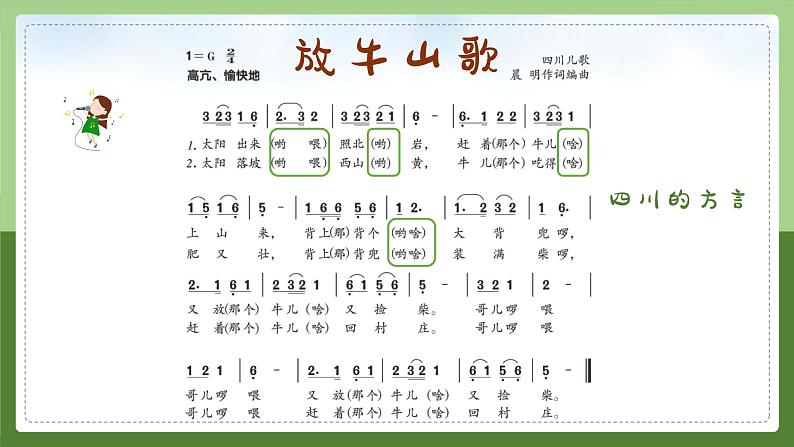 这是一份人音版放牛山歌课前预习ppt课件,共16页。PPT课件主要包含了放牛山歌,四川的方言,注意唱够拍等内容,欢迎下载使用。