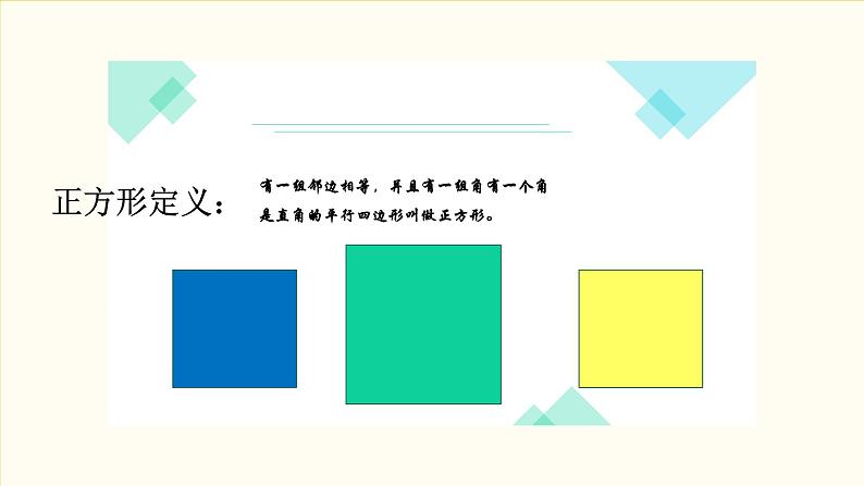 有一组邻边相等,并且有一个角是直角的平行四边形叫做正方形. 有一组邻边相等的矩形叫做正方形. 有一个角是直角的菱形是正方形