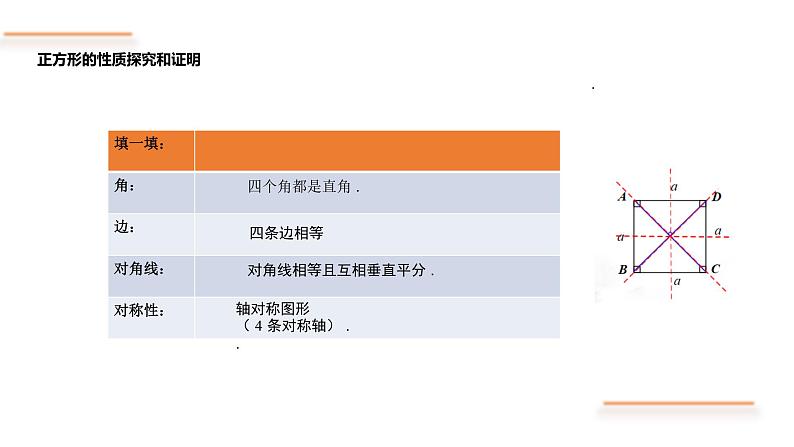 正方形的四个角都是直角,四条边相等. 正方形的对角线相等且互相垂直平分.