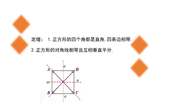 定理: 1.正方形的四个角都是直角,四条边相等. 2.正方形的对角线相等且互相垂直平分.