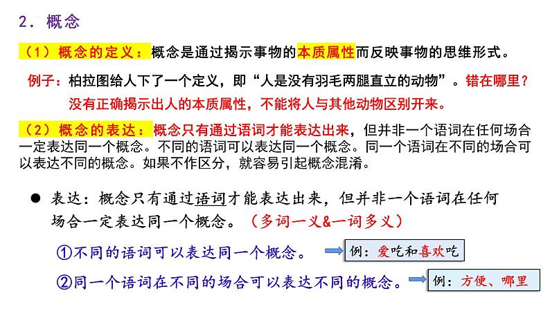 2.概念(1)概念的定义:概念是通过揭示事物的本质属性而反映事物的思维形式。