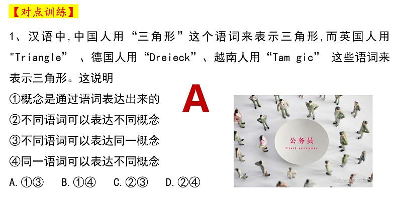 1、汉语中,中国人用“三角形”这个语词来表示三角形,而英国人用"Triangle” 、德国人用“Dreieck”、越南人用“Tam gic” 这些语词来表示三角形。这说明①概念是通过语词表达出来的 ②不同语词可以表达不同概念 ③不同语词可以表达同一概念 ④同一语词可以表达不同概念A.①③ B.①④ C.②③ D.②④