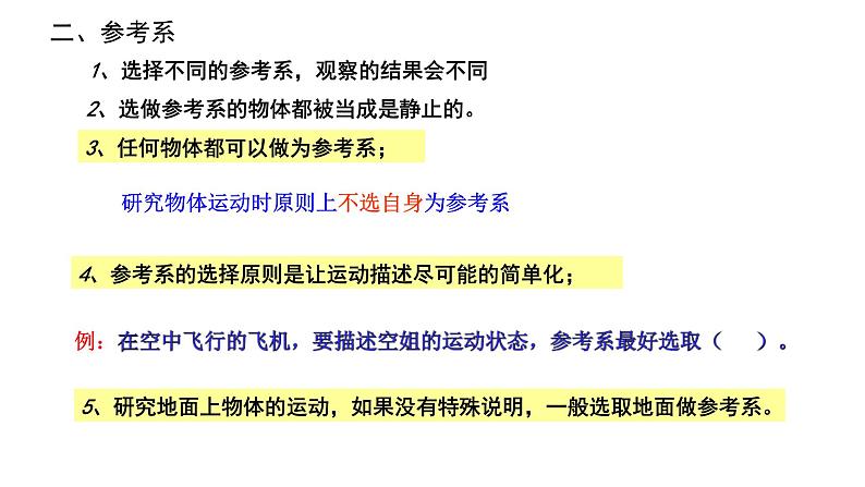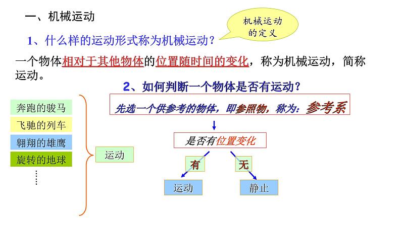 第1节 空间与时间 不了解运动,就不了解自然。——亚里士多德 自然界中的运动,形式多样,复杂而又多变。大到天体,小到微观粒子都有它的运动形式。 为了更好的研究运动,人们根据物质运动的特点将运动的类型分为:机械运动 热运动 电磁运动 等…… 其中,机械运动是自然界中最普遍的运动形式,简称为运动。一、机械运动1、什么样的运动形式称为机械运动?机械运动的定义一个物体相对于其他物体的位置随时间的变化,称为机械运动,简称运动。运动2、如何判断一个物体是否有运动?先选一个供参考的物体,即参照物,称为:参考系是否有位置变化有无运动静止奔跑的骏马……旋转的地球翱翔的雄鹰飞驰的列车以楼房或地面为参考系,则站在运行电梯中的乘客是:以电梯为参考系,则站在运行电梯中的乘客是:运动静止3、运动的描述是相对的。以运行的电梯为例二、参考系1、选择不同的参考系,观察的结果会不同 坐在行驶的车上,看到路边的树向后退去;站在路旁的人看到同一棵树静静的立在路旁。原因? 诗中:“满天云不动”是选( )为参考系;“云与我俱东”又是以( )为参考系。飞花两岸照船红,百里榆堤半日风,卧看满天云不动不知云与我俱东。2、选做参考系的物体都被当成是静止的。 练1练2练3甲乙两龙舟在水面并行,甲乘客看到远处的树木向东移动,乙乘客认为甲静止,如果以地面为参考系,则甲乙的运动情况?自己大地甲乙以相同的速度都向西运动二、参考系3、任何物体都可以做为参考系;4、参考系的选择原则是让运动描述尽可能的简单化;例:在空中飞行的飞机,要描述空姐的运动状态,参考系最好选取( )。5、研究地面上物体的运动,如果没有特殊说明,一般选取地面做参考系。研究物体运动时原则上不选自身为参考系1、选择不同的参考系,观察的结果会不同 2、选做参考系的物体都被当成是静止的。 运动是物体间相对位置的变化,因此要知道位置怎样变化首先要先能够描述物体的位置。汽车在距离市中心500米处。这样的描述准确吗?应该怎样描述?三、空间位置的描述判断缺少了方向描述。1、位置的描述必须要有两个要素:方向和距离汽车在距离市中心正东500米处数学的坐标系方法可以很好的用来来描述方向和距离。所以物理学中常利用坐标系来描述物体的空间位置。坐标系的种类? 如何建立坐标系呢? 三、空间位置的描述2、用坐标系描述物体的位置(1)沿直线运动的物体可用一维坐标来描述位置例如:一辆汽车正位于市中心东边500m的位置。一辆汽车正位于市中心西边500m的位置。汽车位置表示为:X=500m汽车位置表示为:X=-500m这里的负号表示与规定的正方向相反,不表示大小。以市中心为原点,以东为正方向,以m为单位,建立一维坐标。如图1-2坐标构成要素:原点、正方向、标度三、空间位置的描述 如果汽车是从市中心出发先向正北方行驶100m,再向东行驶150m,到达图1-3所示的位置,仍以市中心为参考点,要如何描述汽车的位置?三、空间位置的描述(2)在同一平面运动的物体可用二维直角坐标来描述位置坐标构成要素:原点、正方向、标度卫星定位导航系统三、空间位置的描述运动过程都要经历一定的时间,描述物体所处位置时也要与具体的时刻相对应。四、时间的描述指两个时刻之间的间隔。时刻:指某一瞬时如:8:00开始上课时间:如:一节课8:00开始上课,8:45下课,历时45分钟时间时刻四、时间的描述指出2003年我国首次载人飞船飞行中的一些时间与时刻。时刻时刻时刻时间时间可以用时间轴来表示时间与时刻:时间,时间数轴上对应两点间的一段时刻,时间数轴上对应于一点 物理上用t表示时间,如果有两个时刻t1和t2,则这两个时刻的时间间隔 t=t2-t1四、时间的描述 关于时间与时刻须注意的几个问题:1)n秒末、n秒初是指时刻,第n秒内是指1秒的时间。前1s第1s内前3s 如第1秒末、第2秒初、第4秒末等都表示时刻,而且第1秒末和第2秒初是同一时刻。两个时刻之间的线段表示时间间隔,即时间。第2秒末和第6秒末两个时刻之间的时间间隔是4秒,即时间间隔=终止时刻-开始时刻。第4秒末或第5秒初四、时间的描述第5s内第二个2s内 2)时间的单位:时(h)、分(min)、秒(s)、飞秒(fs)、阿秒(as),国际单位用秒(s)来表示。注意换算公式1fs= s, 1as= s。3)计时器:生活中的手表、 石英钟、实验室用的打点计时器和秒表等。四、时间的描述四、时间的描述课本P17-18 第2、3、4、5题预习第2节, 自主学习