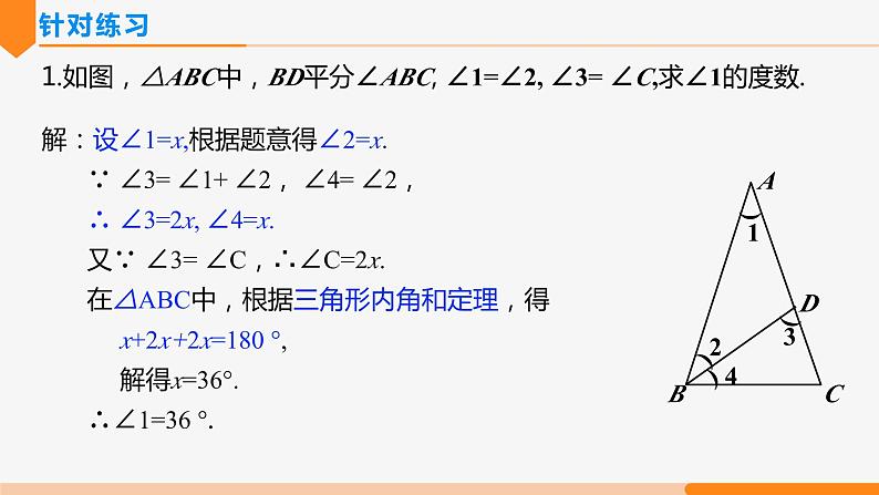 数学思想方法复习整理|第 2 课时|第十一章 三角形复习整理 (第2课时)方程思想分类讨论整体思想化归思想方程思想例1 如图,在△ABC中,∠C=∠ABC,BE⊥AC, △BDE是等边三角形,求∠C的度数. 解:设∠C=x °,则∠ABC=x°.∵△BDE是等边三角形,∴∠ABE=60°, ∴∠ EBC=x°- 60°.在△BCE中,根据三角形内角和定理,得: 90°+x°+x°- 60°=180°, 解得 x=75.∴∠C=75 °.求角度问题常常把这个角放在三角形中,运用三角形内角和定理、外角关系建立方程(组)。解方程(组)从而求解.归纳小结针对练习1.如图,△ABC中,BD平分∠ABC, ∠1=∠2, ∠3= ∠C,求∠1的度数.解:设∠1=x,根据题意得∠2=x.∵ ∠3= ∠1+ ∠2, ∠4= ∠2,∴ ∠3=2x, ∠4=x.又∵ ∠3= ∠C,∴∠C=2x.在△ABC中,根据三角形内角和定理,得x+2x+2x=180 °,解得x=36°.∴∠1=36 °.分类讨论思想解:∵ DB为△ABC的中线,∴ AD=CD.设 AD=CD=x cm,则AB=2x cm,当 x+2x=12,BC+x=15时,解之得 x=4,BC=11 cm.此时△ABC的三边长为AB=AC=8 cm,BC=11 cm,能组成三角形;当x+2x=15,BC+x=12时,解得x=5,BC=7 cm.此时△ABC的三边长为AB=AC=10 cm,BC=7 cm,能组成三角形.综上所述,三角形的各边长分别为:8、8、11或10、10、7.例2 在△ABC中,AB=AC,DB为△ABC的中线,且BD将△ABC周长分为12 cm与15 cm两部分,求三角形各边长. xx2x分类讨论问题为什么要分类讨论:在一个数学条件,结果不唯一怎样分类讨论:根据情况不重不漏列出可能性怎样写答案:把各个答案综合整理写出结果归纳小结针对练习2.已知等腰三角形的两边长分别为10 和6 ,则三角形的周长是 .解 由于没有指明等腰三角形的腰和底,所以要分两种情况讨论:当10为腰时,则6为底,此时三边长能构成三角形,符合题意.所以周长为26;当10为底时,则6为腰,此时三边长能构成三角形,符合题意.此时周长为22.综合上得:三角形的周长是26或22.26或22整体思想例3 .如图,在△ABC中,点P是∠ABC,∠ACB的平分线的交点.(1) 若∠A=60°,求∠BPC 的度数.(2) 若∠A=n,求∠BPC 的度数.运用整体思想能使数学问题变难为易、化繁为简,主要表现整体代入、整体求值、整体设元等形式归纳小结整体思想3 .如图,在△ABC中,点P是∠ABC,∠ACB的平分线的交点.(1) 若∠BPC=120°,求∠A 的度数.(2) 若∠BPC=n,求∠A 的度数.化归思想例4 如图,求∠A+∠B+∠C+∠D+∠E+∠F+∠G的度数.解:连接CD,可知 ∠FCD+∠GDC=∠F+∠G,∴∠A+∠B+∠C+∠D+∠E+∠F+∠G=(5-2)×180 °=540 °.课堂练习1.在△ABC中,三个内角∠A,∠B,∠C满足∠B-∠A=∠C-∠B,则∠B= . 60°2.如图,在△ABC中,CE,BF是两条高,若∠A=70°,∠BCE=30°,则∠EBF的度数是 ,∠FBC的度数是 .3.如图,在△ABC中,两条角平分线BD和CE相交于点O,若∠BOC=132°,那么∠A的度数是 .20°40°84°4.如图①②,试探究∠1,∠2与∠3,∠4之间的数量关系;解:设∠1的邻补角为∠5,∠2的邻补角为∠6.∵∠3,∠4,∠5,∠6是四边形的四个内角,∴∠3+∠4+∠5+∠6=360°.∴∠3+∠4=360°-(∠5+∠6).∵∠1+∠5=180°,∠2+∠6=180°,∴∠1+∠5+∠2+∠6=360°,∴∠1+∠2=360°-(∠5+∠6).∴∠1+∠2=∠3+∠4.5.凸六边形纸片剪去一个角后,得到的多边形的边数可能是多少?画出图形说明.解:∵ 六边形截去一个角的边数有增加1、减少1、不变三种情况,∴ 新多边形的边数为7、5、6三种情况,如图所示.6.如图,求∠1+∠2+∠3+∠4+∠5+∠6+∠7的度数.解:连接CG.在△COG和△AOB中,∵ ∠COG=∠AOB,∴ ∠6+∠7=∠OCG+∠OGC.在五边形CDEFG中,∵ ∠1+∠2+∠3+∠4+∠5+∠OCG+∠OGC=540°,∴ ∠1+∠2+∠3+∠4+∠5+∠6+∠7=540°.