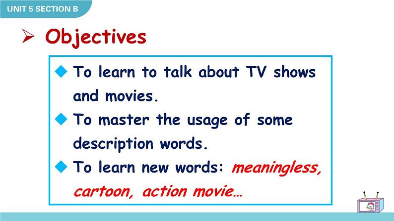 展开T learn t talk abut TV shws and mvies.T master the usage f sme descriptin wrds. T learn new wrds: meaningless, cartn, actin mvie…