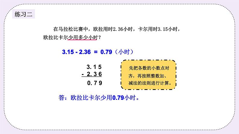 在马拉松比赛中,欧拉用时2.36小时,卡尔用时3.15小时,欧拉比卡尔少用多少小时?