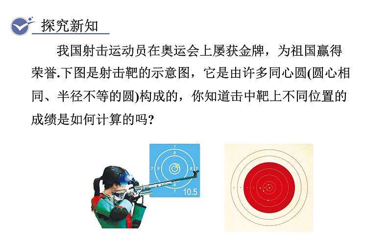 我国射击运动员在奥运会上屡获金牌,为祖国赢得荣誉.下图是射击靶的示意图,它是由许多同心圆(圆心相同、半径不等的圆)构成的,你知道击中靶上不同位置的成绩是如何计算的吗?