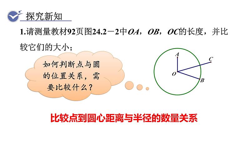 1.请测量教材92页图24.2-2中OA,OB,OC的长度,并比较它们的大小;