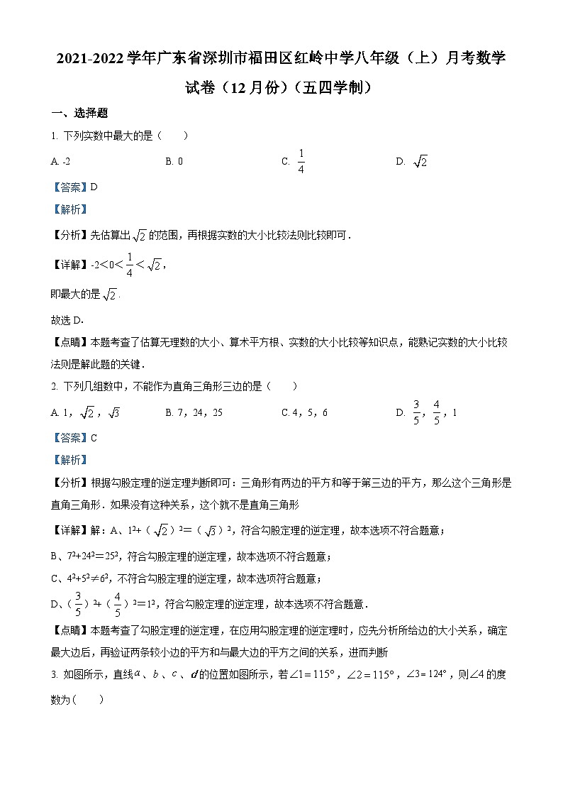 这是一份精品解析:广东省深圳市福田区福田区红岭中学(红岭教育集团)2021-2022学年八年级上学期12月月考数学试题,文件包含精品解析广东省深圳市福田区福田区红岭中学红岭教育集团2021-2022学年八年级上学期12月月考数学试题原卷版docx、精品解析广东省深圳市福田区福田区红岭中学红岭教育集团2021-2022学年八年级上学期12月月考数学试题解析版docx等2份试卷配套教学资源,其中试卷共24页, 欢迎下载使用。