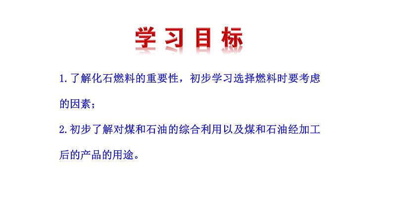 1.了解化石燃料的重要性,初步学习选择燃料时要考虑的因素;2.初步了解对煤和石油的综合利用以及煤和石油经加工后的产品的用途。