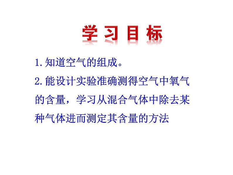 1.知道空气的组成。2.能设计实验准确测得空气中氧气的含量,学习从混合气体中除去某种气体进而测定其含量的方法
