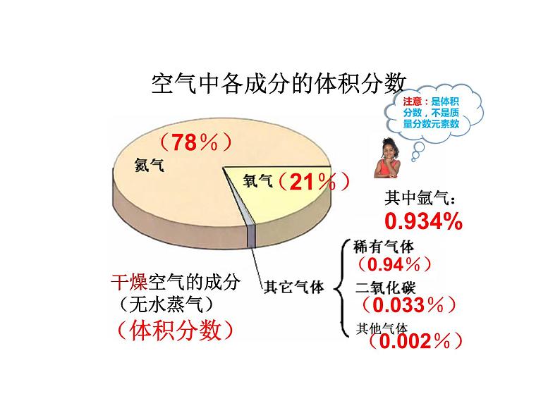 1.空气的成分按体积计算,大约是:氮气78%,氧气21%,稀有气体0.94%,二氧化碳0.03%,其他气体和杂质0.03%。2.通过“测定空气中氧气含量”的实验,我们要得到实验结论思路需要明确:实验目的→实验原理→实验步骤等。