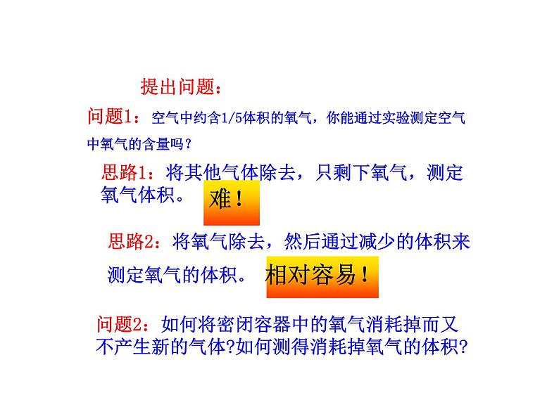 问题2:如何将密闭容器中的氧气消耗掉而又不产生新的气体?如何测得消耗掉氧气的体积?