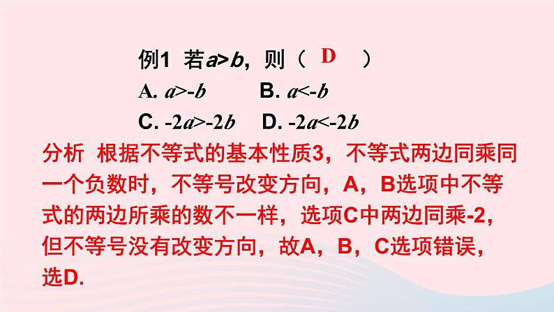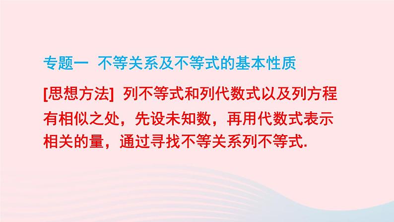 北师版 八年级下册本章专题整合训练专题一 不等关系及不等式的基本性质[思想方法] 列不等式和列代数式以及列方程有相似之处,先设未知数,再用代数式表示相关的量,通过寻找不等关系列不等式.例1 若a>b,则( )A. a>-b B. a-2b D. -2ab+x B. -a+1