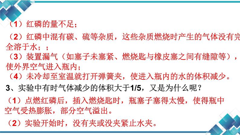 (3)装置漏气(如塞子未塞紧、燃烧匙与橡皮塞之间有缝隙等),使外界空气进入瓶内;