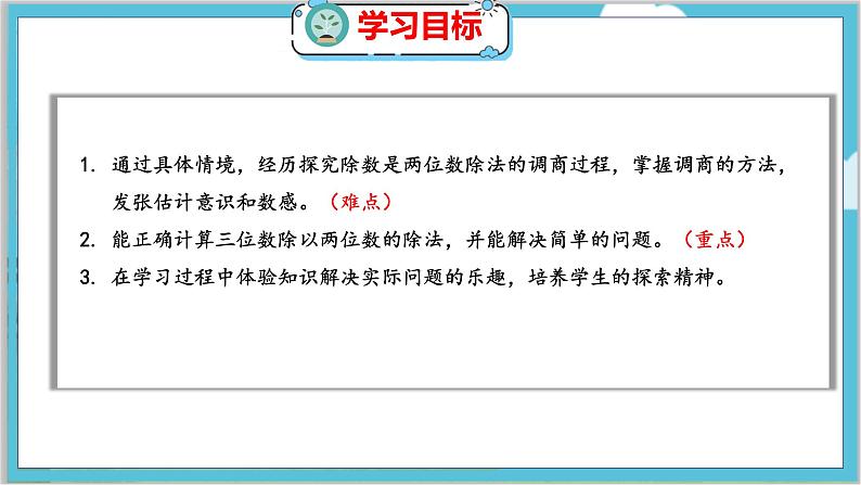 通过具体情境,经历探究除数是两位数除法的调商过程,掌握调商的方法,发张估计意识和数感。(难点)能正确计算三位数除以两位数的除法,并能解决简单的问题。(重点)在学习过程中体验知识解决实际问题的乐趣,培养学生的探索精神。