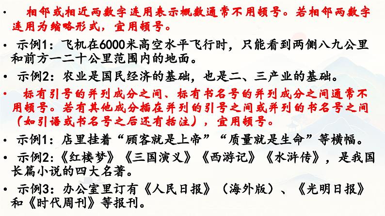 这是一份2024届高考专题复习:语言文字运用之标点符号的用法归纳 课件,共60页。PPT课件主要包含了表示概数时不用顿号,总结上文,提示下文,简要公式等内容,欢迎下载使用。