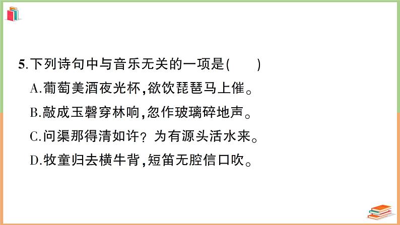 第七单元综合训练时间:90分钟 满分:100分基础积累一、根据拼音和语境,在括号里写出正确的词语。(6分)1.贝多芬借着qīnɡ yōu( )月光按起了qín jiàn( ),皮鞋匠兄妹俩 táo zuì( )在这美妙的琴声中。2.住在lái yīn hé( )畔máo wū( )里的mánɡ ɡū niɑnɡ( ),听着美妙的音乐,仿佛看见了月光照耀着的大海。二、选择正确的答案,在括号里填上序号。(12分)1.下列词语中加点字的读音不完全正确的一项是( )A.琴弦(xián) 善哉(zāi) 锦缎(jǐn)B.乐谱(yuè) 处理(chǔ) 如数家珍(shǔ)C.画轴(zhóu) 奴婢(bì) 微波粼粼(lín)D.曝晒(pù) 纯熟(shú) 戛然而止(ɡá)2.下列加点字的解释错误的一项是( )A.以为世无足复为鼓琴者(脚下)B.方鼓琴而志在太山(心志,情志)C.尾搐入两股间(抽缩)D.今乃掉尾而斗(摆动,摇)3.下列词语中,指一场演出的倒数第二个上台表演的剧目的一项是( )A.亮相 B.压轴 C.压台 D.行头4.下列加点的词语使用不正确的一项是( )A.空旷的恩施大峡谷中回荡着断断续续的歌声。B.随州市曾侯乙编钟所敲出的乐曲饱含一种黄钟大吕的气势。C.南岩山势状如垂天之翼,这等奇峰真可谓巧夺天工。D.他的书法苍劲有力,真有笔走龙蛇之势。5.下列诗句中与音乐无关的一项是( )A.葡萄美酒夜光杯,欲饮琵琶马上催。B.敲成玉磬穿林响,忽作玻璃碎地声。C.问渠那得清如许?为有源头活水来。D.牧童归去横牛背,短笛无腔信口吹。6.下列句子中运用的修辞手法相同的一项是( )①月亮越升越高,穿过一缕一缕轻纱似的微云。②这,哪里还是戏剧?这,不是太像杂技了吗?③双方正在对打,激烈到简直是风雨不透。④善哉乎鼓琴,汤汤乎若流水。A.①③ B.①④ C.②③ D.②④三、先将词语补充完整,再给词语分类。(填序号)(7分) ①天( )之音 ②( )歌( )舞③画( )点( ) ④( )( )如生⑤行( )流( ) ⑥余音( )( )⑦妙笔( )花 ⑧惟( )惟( )1.赞美声音优美动听的词语有:__ __。(1分)2.表示写作水平极为高超的词语有:__ __。(1分)3.赞美艺术等生动逼真的词语有:__ __。(1分)四、按要求完成句子练习。(6分)1.贝多芬花了一夜工夫才记录完刚才即兴创作的《月光曲》。(缩句) 2.京剧有很多数不清的艺术特色。(修改病句) 3.月光照进窗子,茅屋里的一切好像披上了银纱,显得格外清幽。(照样子,补充句子)微风吹拂着湖面,_ ________________________________________________________________________五、忆一忆,填一填。(10分)1.方鼓琴而志在太山,锺子期曰:“__________________,__________________。”少选之间而志在流水,锺子期又曰:“__________________,__________________。”2.根据《伯牙鼓琴》这个故事,人们把__________________称为知音,并用“高山流水”这个成语比喻__ _____ _________________。3.皮鞋匠看看妹妹,月光正照在她那恬静的脸上,照着她__________________的眼睛。她仿佛也看到了,看到了她从来没有看到过的景象——月光照耀下的__________________的大海。4.《京剧趣谈》一文通过介绍“__________________”和“__________________”,让我们了解了京剧表演在道具使用及动作造型方面的一些特点。六、综合性学习。(5分)阅读下面的“飞飞转”制作说明书,然后完成练习。“飞飞转”制作说明书工具:钳子、剪刀、铁钉、锤子、直尺、铅笔。材料:饮料罐铝片1张,60厘米长的铁丝一段。做法:①先将铁丝折弯成双股,将铅笔插入弯头捏紧,然后用钳子夹紧另一端,将双股铁丝绞在一起。②剪取15cm×1cm、1cm×1cm废弃饮料罐铝片各1片,并将长方形铝片弯成圆环状。③在圆环形铝片上用铁钉穿出两个相对的小孔,在正方形铝片的中心穿一小孔。④将绞好的铁丝穿过圆环和小方铝片上的小孔(小方铝片在中间),然后将圆环铝片稍稍压扁,“飞飞转”便完成了。1.下面的说法正确的打“√”,错误的打“×”。(3分)(1)“飞飞转”是一种用金属制成的小玩具。 ( )(2)制作过程中需要一个大正方形、一个小长方形铝片。 ( )(3)制作“飞飞转”只需要穿两个孔。 ( )2.铁丝尖端及铝片边缘坚硬锐利,你觉得应该怎样提醒制作者注意安全?(2分) 阅读理解七、阅读文言文,完成练习。(10分)书戴嵩画牛蜀中有杜处士 ,好书画,所宝以百数。有戴嵩《牛》一轴,尤所爱,锦囊玉轴,常以自随。一日曝书画,有一牧童见之,拊掌大笑,曰:“此画斗牛也。牛斗,力在角,尾搐入两股间,今乃掉尾而斗,谬矣。”处士笑而然之。古语有云:“耕当问奴,织当问婢。”不可改也。1.解释下列加点的字。(2分)(1)好书画 __________________(2)一日曝书画 __________________2.读了“蜀中有杜处士,好书画”这句话,我能想象到杜处士爱书画的表现:__ __________ __ __________________________ __________ _______________________(2分)3.在解释正确的句子后打“√”。(3分)(1)“所宝以百数”的意思是他所珍藏的书画数以百计。 ( )(2)“今乃掉尾而斗”的意思是今天却调换了尾巴打斗。 ( )(3)“处士笑而然之”的意思是杜处士笑了笑,认为他说得对。 ( )4.文中牧童和杜处士“笑”的方式有何不同?请找出来写在下面。这两种“笑”分别体现了两人什么样的性格特点?(2分) 5.这则文言文蕴含了什么道理?请用“____”在文中画出来。(1分)八、阅读短文,完成练习。(14分)看戏(节选)叶君健时间是晚上八点。太阳虽然早已经下落,但暑气并没有收敛。没有风。公园里那些屹立着的古树是静静的。树叶子也是静静的。露天的“劳动剧场”也是静静的。但剧场里并不是没有人。相反地,人挤得非常满。每个角
