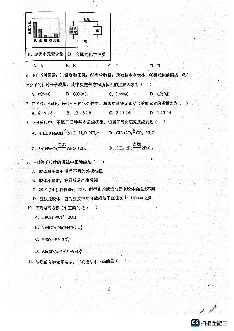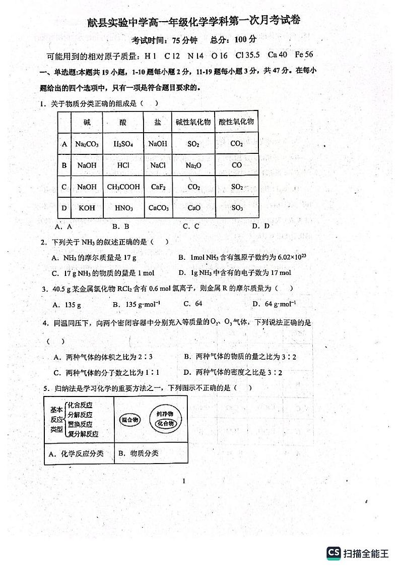 这是一份河北省沧州市献县实验中学2023-2024学年高一上学期10月月考化学试题(月考),共6页。